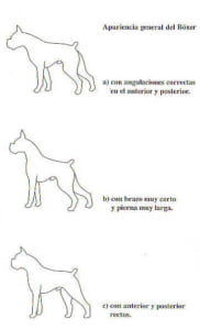 El BóXER es un perro de tamaño mediano, de pelo liso, fuerte, con una estructura corta y cuadrada y huesos fuertes. Su musculatura es seca, fuertemente desarrollada y en relieve. Sus movimientos son vivaces, llenos de fuerza e hidalguía. El BóXER no debe parecer tosco, pesado o liviano.